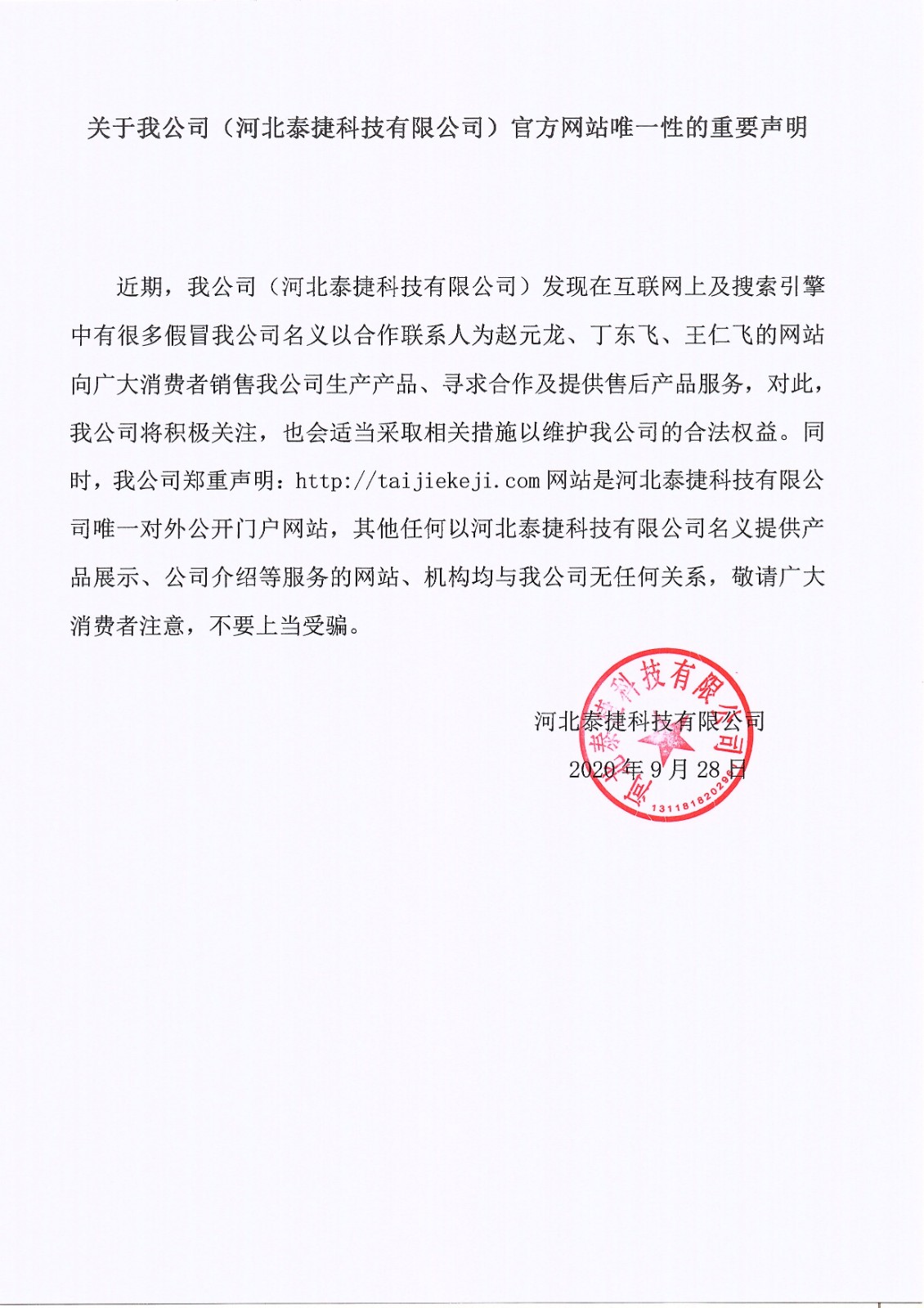 公告:关于我公司(河北泰捷科技有限公司)官方网站唯一性的重要声明(点击查看)!